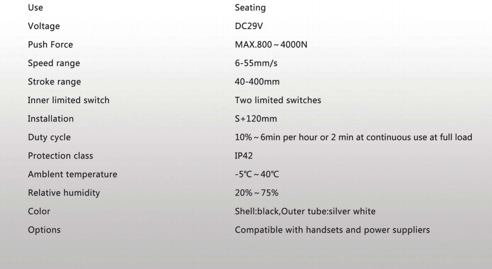 本產品已通過CE、UL、PSE、ISO9001認證,它有一個新穎的外觀和制作精良,噪音小,操作簡單,讓它成為暢銷國內外,被廣泛用于電動沙發、醫療床、手術床,按摩椅等。